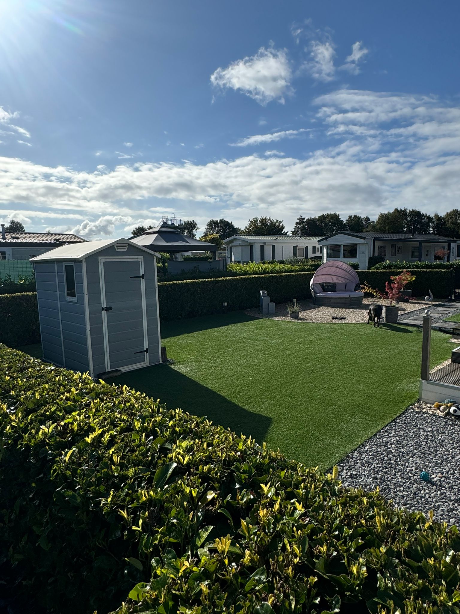 * Schön angelegter Garten mit Kunstrasen, Sonneninsel, Schuppen und Umzäunung